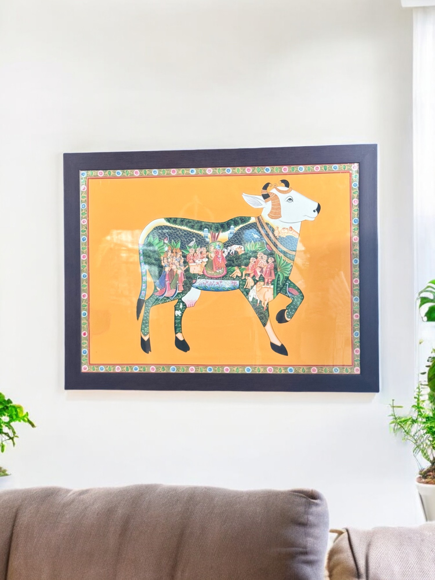 Features: Authentic Pichwai Art, Handcrafted Vintage Frame, Culturally Rich Decor, High-Quality Materials.